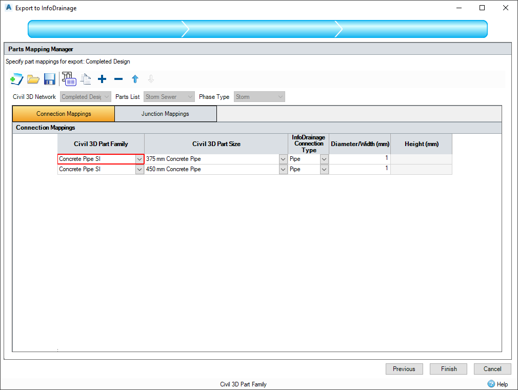 For each selected network there will be a parts mapping step, which allows the mapping of Civil 3D® part types to InfoDrainage types. See Parts Mapping for more details.