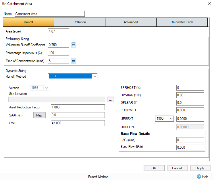 Base Flow - This value replaces the calculated baseflow value to allow a user defined baseflow. The baseflow calculation can be switched off by entering a value of "0 ", it should be left blank in order for the software to calculate it.