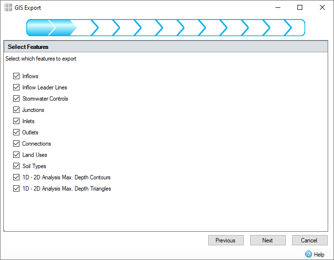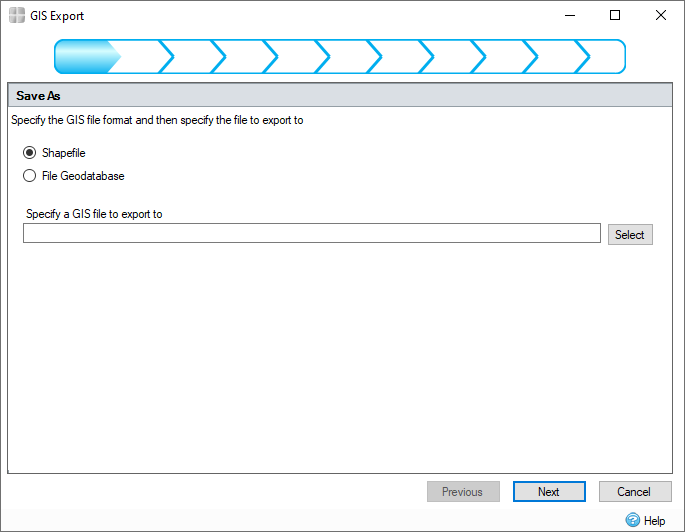 There is a wizard to guide the user through the GIS feature export process. The wizard presents the user with a sequence of dialog boxes that lead the user through a series of well-defined steps. To progress through the steps in the wizard, press the Next button. To return to a previously completed step, press the Previous button.