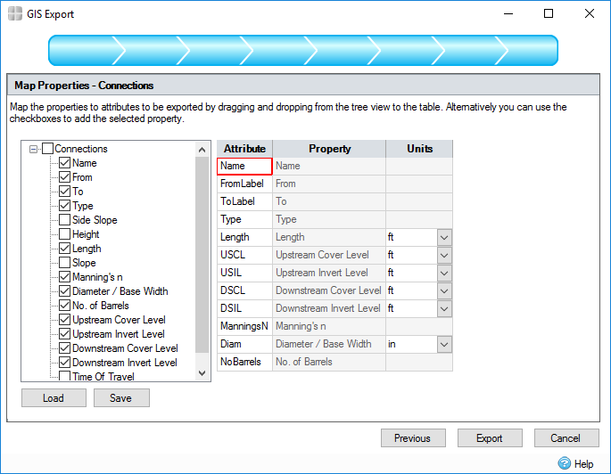 The wizard will display to the user a property mapping step for each feature type being exported. Associated non-spatial information called attributes can be exported with each geographic feature. For example, a collection of manholes may be exported with their names, depths and diameters.