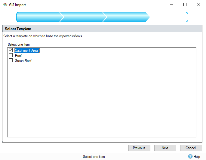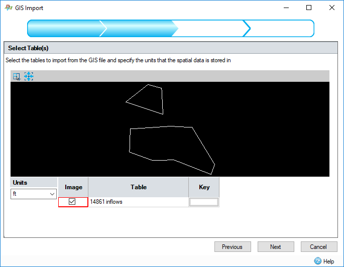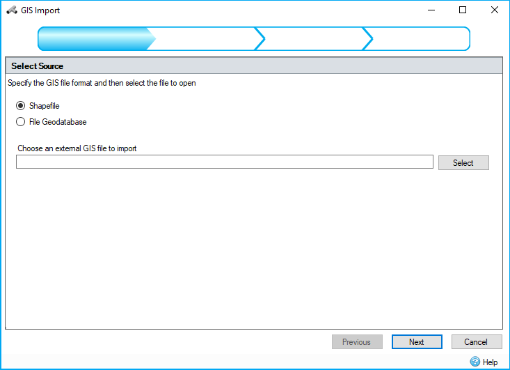 There is a wizard to guide the user through the GIS feature import process. The wizard is a user interface that presents a user with a sequence of dialog boxes that lead the user through a series of well-defined steps. To progress through the steps in the wizard, press the Next button. To return to a previously completed step, press the Previous button.