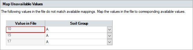 InfoDrainage will attempt to assign the attribute values read from the GIS file to the available InfoDrainage property options for the imported features. If no suitable mapping is discovered for one or more of the GIS attribute values, a further mapping page will be displayed that will allow an association to be made.