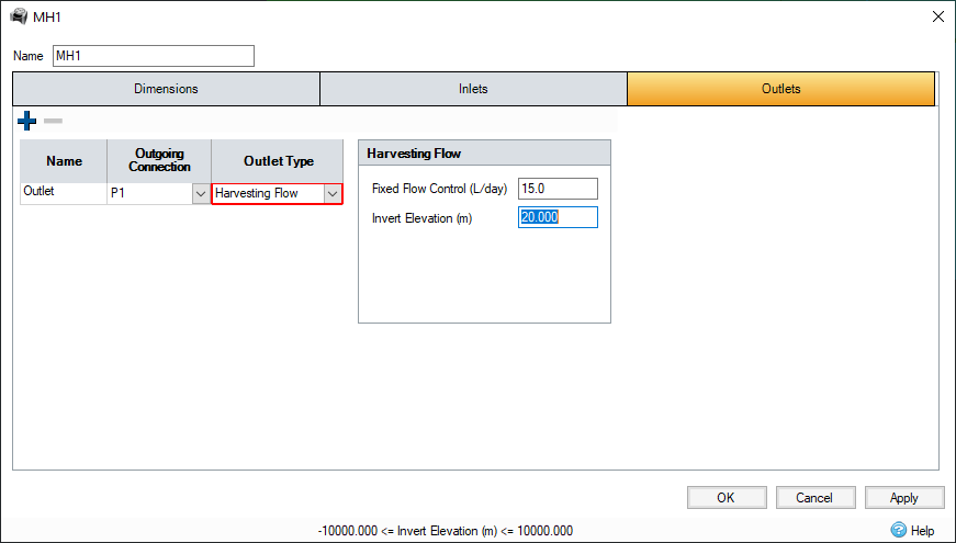 Harvesting Flow Outlet is a type of a Fixed Flow control - the constant flow rate occurs when the water elevation exceeds the invert elevation.