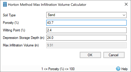 The Horton Infiltration Max Volume Calculator allows the Maximum Infiltration Volume to be calculated for the Horton Infiltration method for use with the SWMM Runoff method.