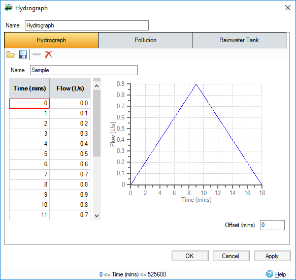 Hydrograph Inflow type. Hydrograph data can either be entered manually, or from an existing hydrograph file by clicking the "Open " icon
