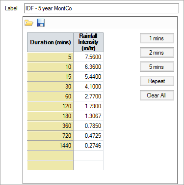The IDF file represents a single frequency and is a sequential list of average intensities for different durations of storm. In the Rational Method, each pipe or channel is designed for the average intensity of storm of a duration equal to its time of concentration. It could be said, therefore, that each pipe or channel in a network is designed for a different storm, as each pipe has a unique time of concentration.