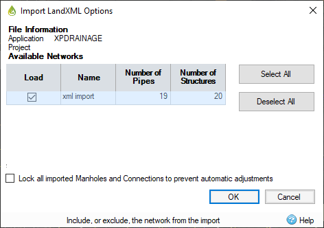 This option allows you to import LandXML file into InfoDrainage. When importing a LandXML file, the contents of the file are shown to allow the selected file to be validated and the required networks to be selected.