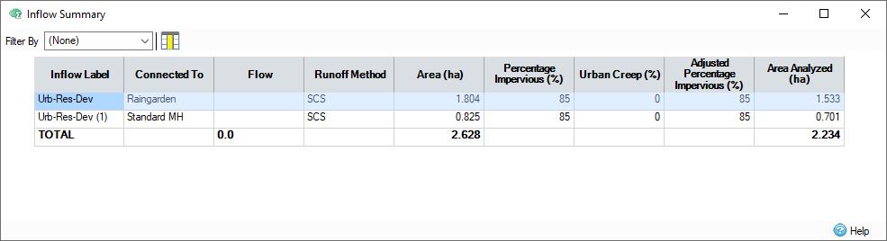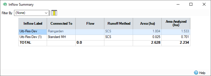 When the Filter By drop-down menu is set to (None), the inflow summary displays phase wide information. All catchment areas and base flows within the phase are displayed, and included in the total value.