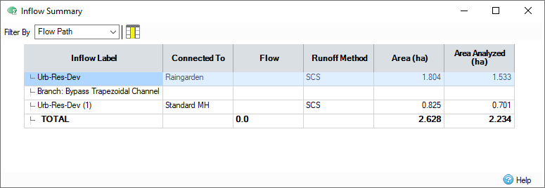 When a flow path is selected in the Filter By drop-down menu, the inflow summary displays only the catchment areas and base flows which are connected to items within the flow path (main line and branch lines).