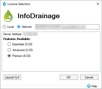 Network - This text box can be used to manually enter a server name or address. This server will be searched for InfoDrainage licenses. If the server with the given name or address cannot be found, or the server does not have any InfoDrainage licenses, an error icon will be displayed here.