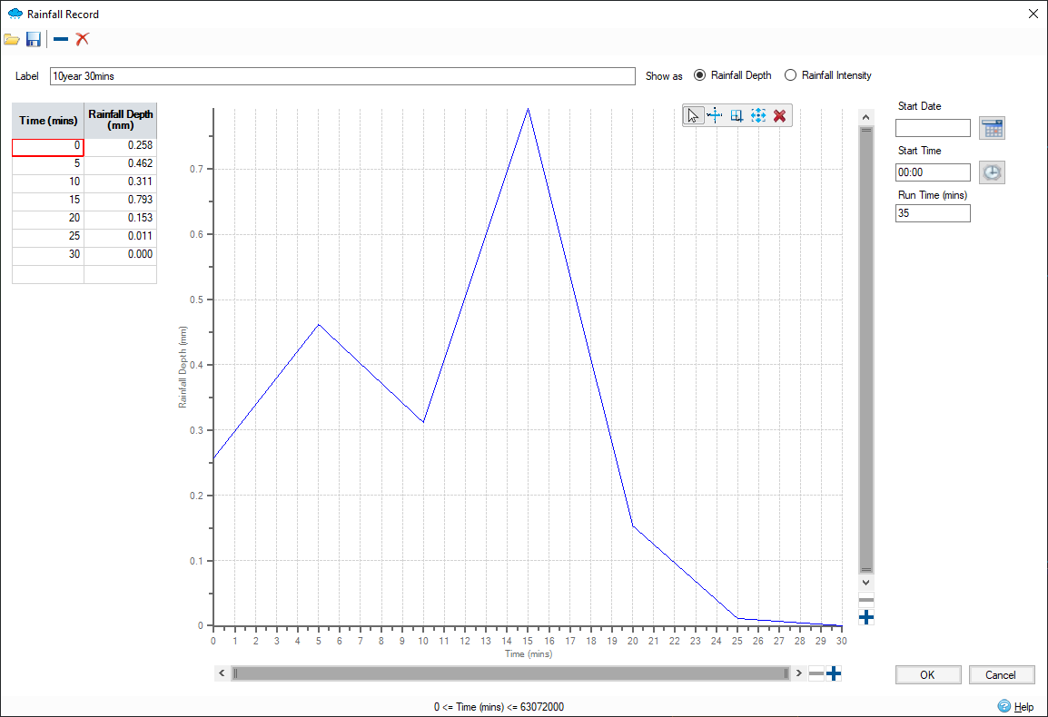 The rainfall record can have variable time steps and cover a period of over 100 years, and it can be entered/loaded as Depth or Intensity values. When showing intensity values the time step for a value is taken as the time between the current value and the next.