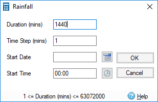 New - Allows a new rainfall record to be created based on a duration and a fixed time step. The following items describe the values that can be entered on the calculator form that appears.