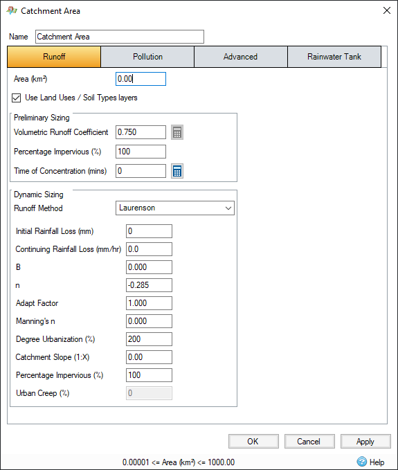 Urban Creep - This scales the impermeable area by the amount specified. This can be used to take the increase of urban areas, or other factors into account. This value is only enabled (and used) when the analysis creep of the Analysis Criteria is set to "Use Catchment Areas ".
