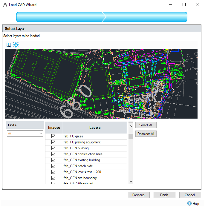 This step allows layers of the CAD file to be turned off before loading, as well as setting the units of the file, providing a preview image of the file, and additional options when loading surface data.