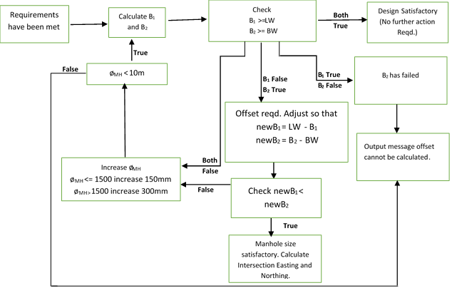 As seen by the above routine the offset either fails and outputs a message, does not require an offset as there is already enough space or calculates a new Intersection Easting and Northing as the offset has been successful.