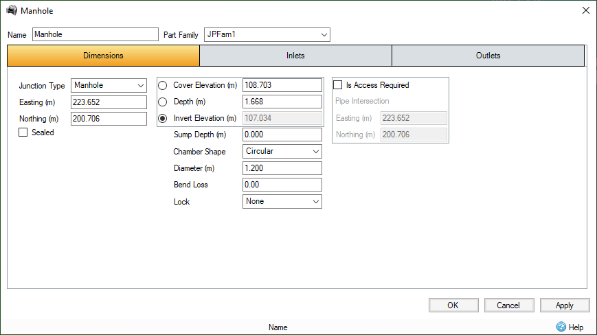 Is Access Required - This checkbox determines if the manhole requires access and therefore if an offset needs to be calculated. Checking this box enables the pipe intersection fields.