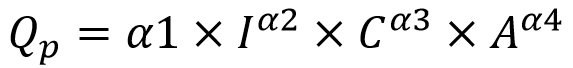 where I is the average slope of the catchment (m/m), C is the runoff coefficient of the catchment (generally assumed equal to the coefficient of impermeabilisation), and A is the catchment area (ha).