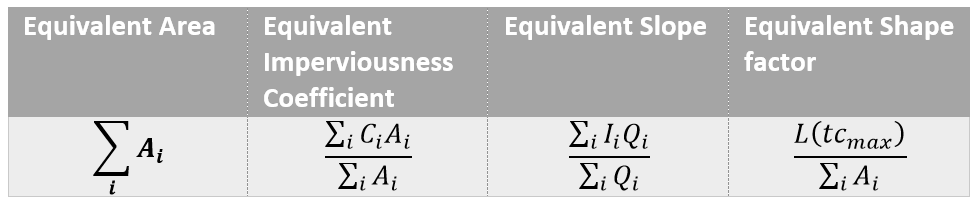 The main distinction is between catchment grouped in a serial way or in a parallel way. Because in InfoDrainage catchments are connected to a connection or to a Stormwater Control (and not to another catchment), only the parallel grouping makes sense in this context. The table below gives the relations used to calculate the equivalent properties of several grouped catchments.