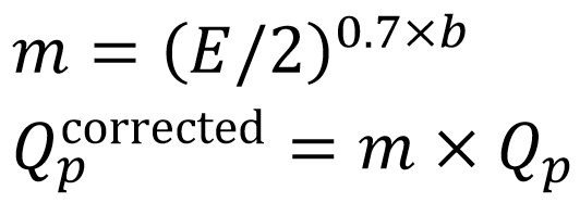where L is the length of the longest hydraulic path in the catchment and A is the area in m². If the shape factor E is very different from 2, the peak flow Qp needs to be corrected by the following shape correction factor: