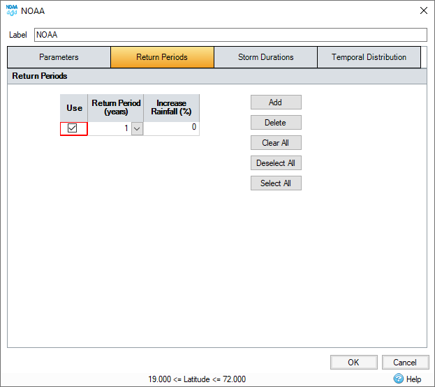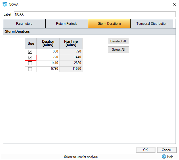 A set of Storm Durations and run times must be specified for the analysis to run back to back. Please note that at least one storm duration must be selected in order to retrieve NOAA temporal distribution data.