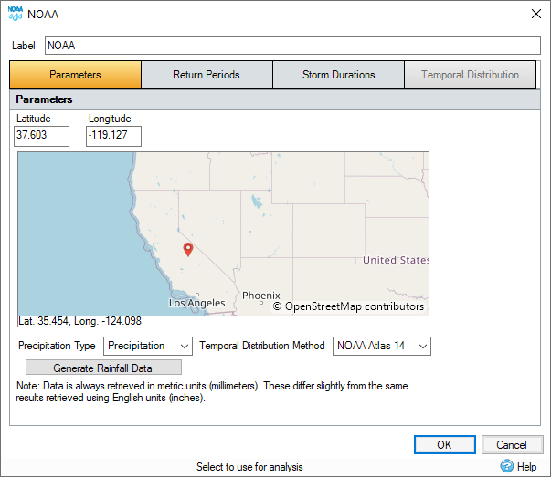 InfoDrainage retrieves rainfall data from the NOAA website in metric units (millimeters). This differs slightly from the same rainfall data retrieved in English units (inches).