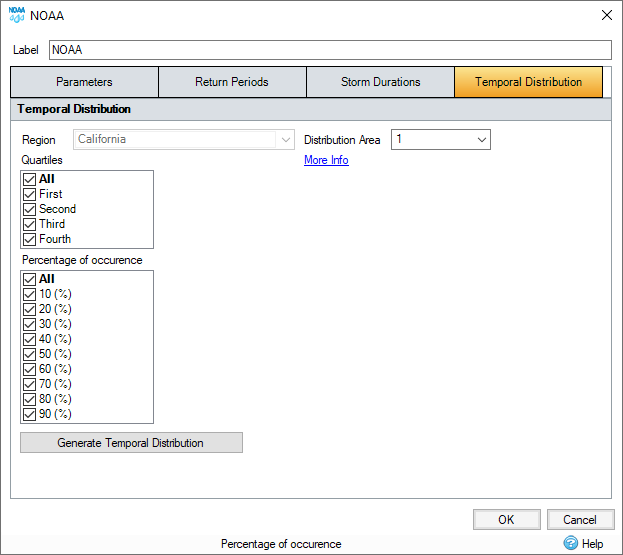 Select the temporal distribution method to use. For the NOAA Atlas 14 method, the temporal distribution data will be retrieved from the NOAA website. For the NRCS method, a series of static tables will be used to generate the temporal distribution data. Please refer to the following links for more information on NRCS temporal distribution data: