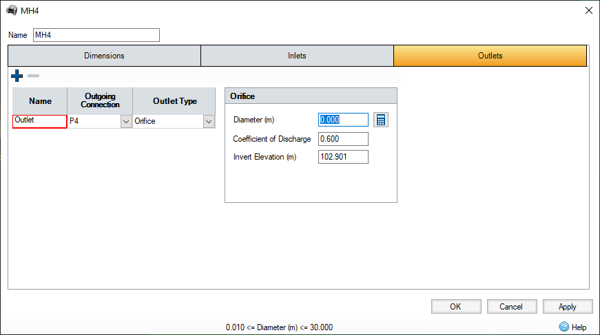 Orifice Outlet allows an Orifice plate control to be modelled.