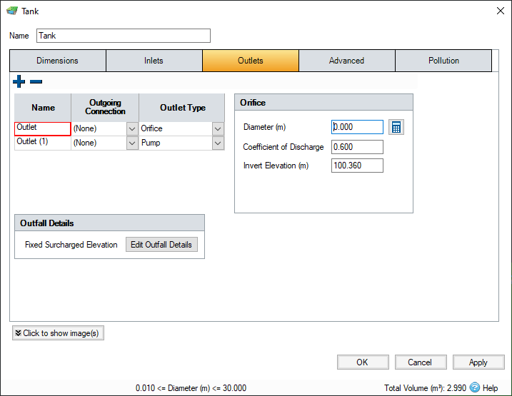Alternatively , when a Junction or SWC is an Outfall location an option that links to the Outfall Details form is shown on the Outlets tab.