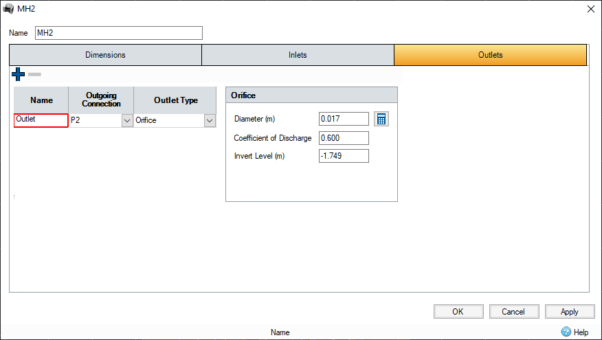 Outlets are created as part of a Junction , Manhole or Stormwater Controls to stipulate how much of the water will leave the structure. They can be accessed via the Outlets tab.