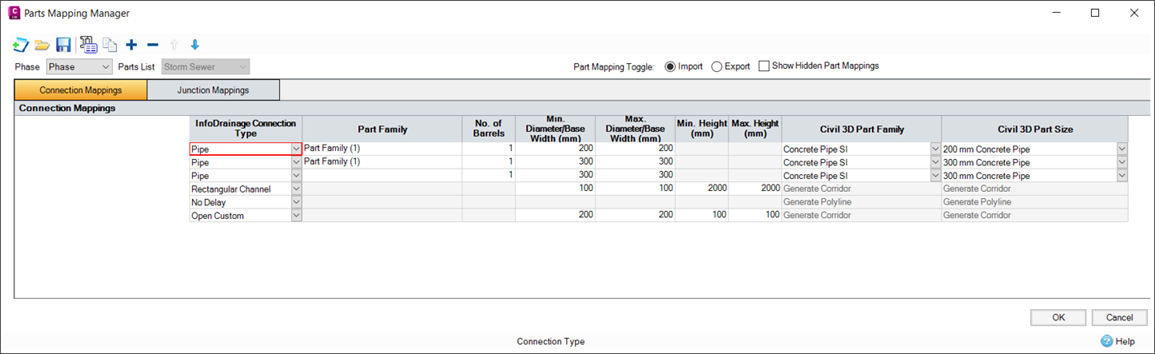 Exclusive to the Part Mapping Manager is a toggle that will swap the current part mapping to either the import mappings taken from the InfoDrainage file or the export mappings which will be taken from the current Civil 3D®networks.