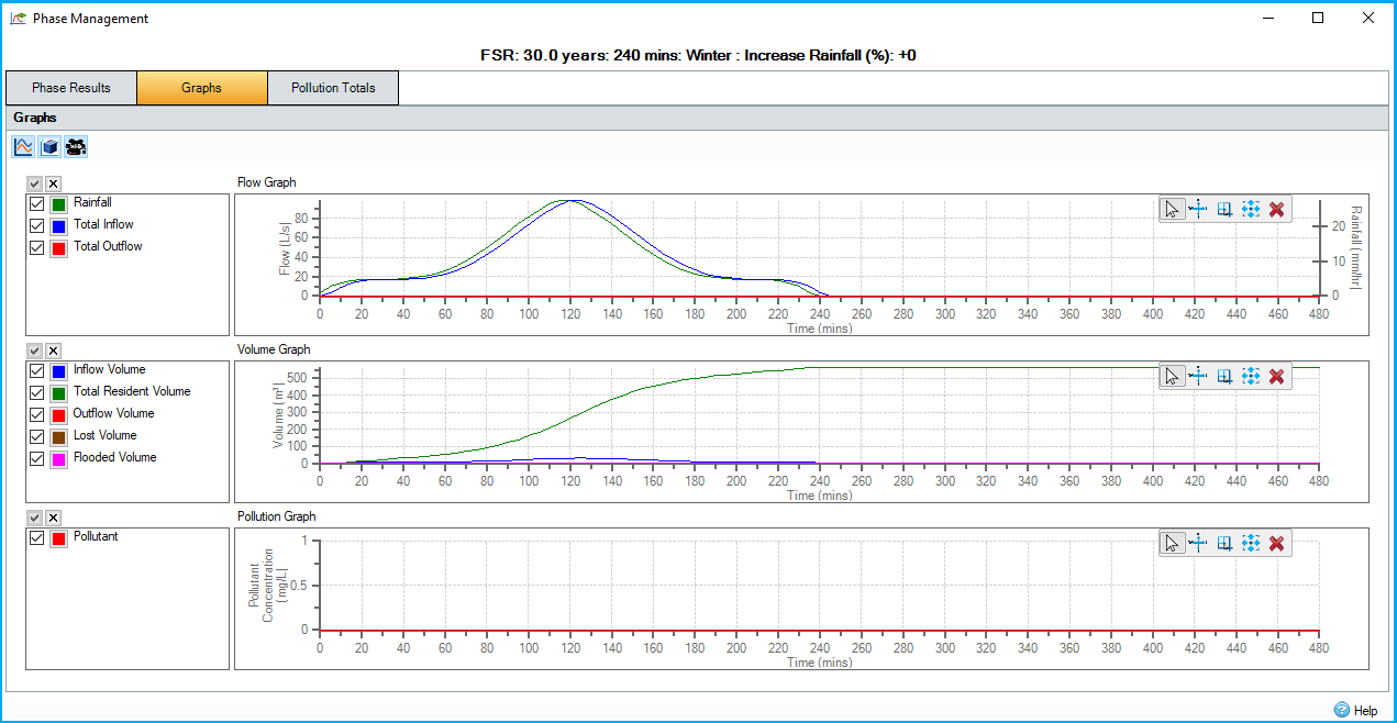 Flows - shows the Inflows and Outflows into/from the Phase against time. For phases containing only Baseflow or Input Hydrographs rainfall will not be available.