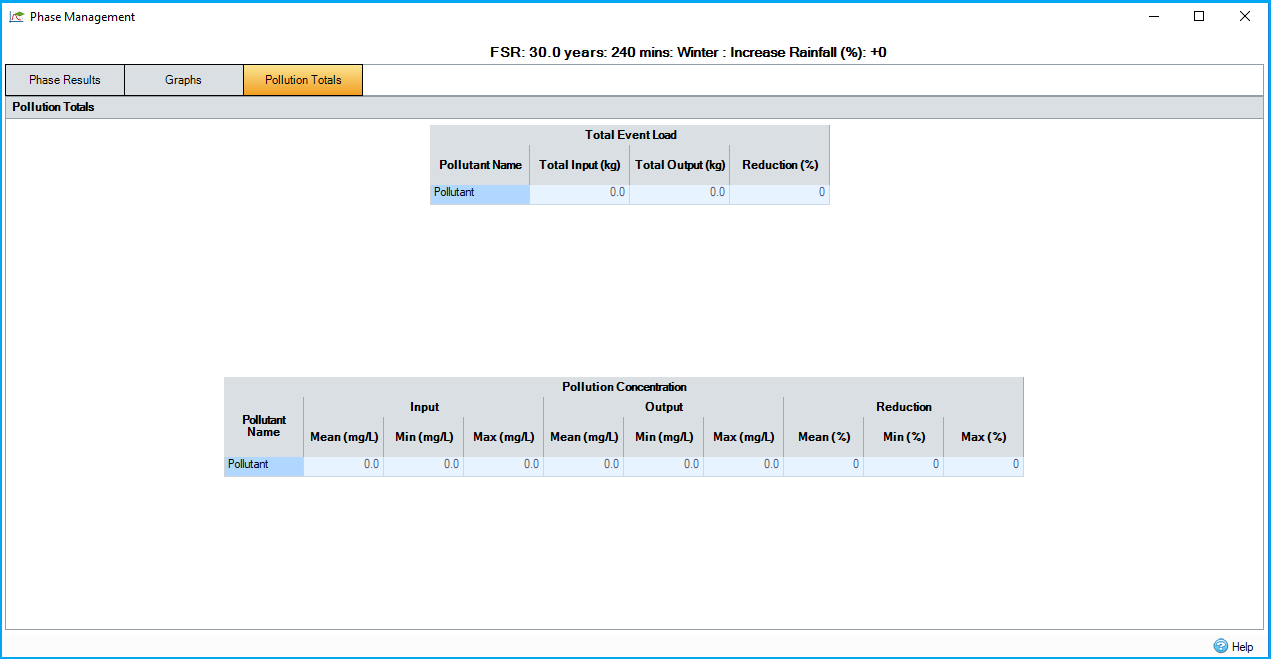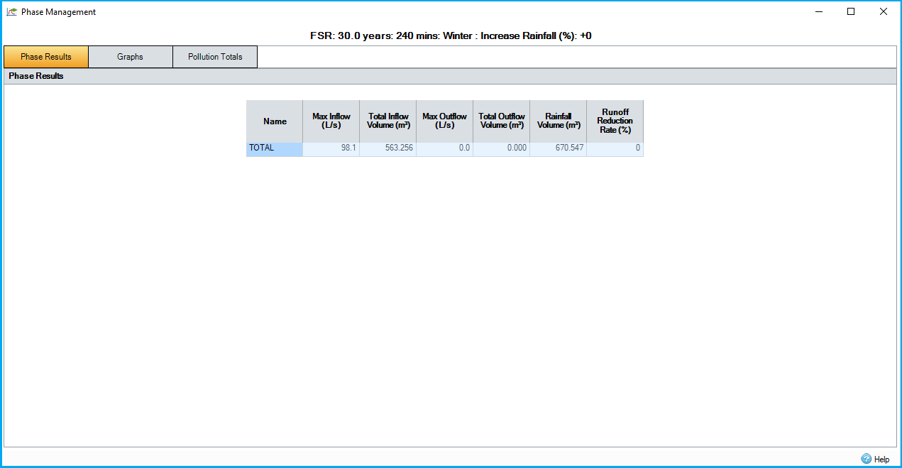 Phase Management - Summary Results shows details of the Inflow/Outflow Rates, Volumes and Pollutants for the current phase and for the current storm/event as highlighted on the Storm Selector (in the Status Bar). This form can be used to get a better idea of how the Site is performing as a whole, especially with regard to pollution reduction.