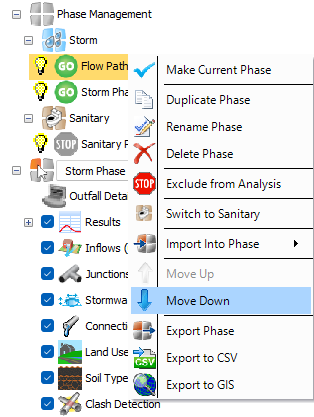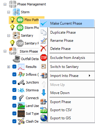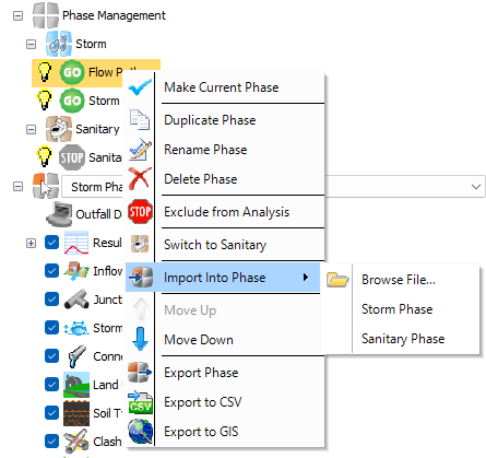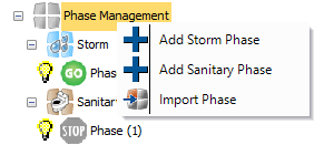 Right-clicking the Phase Management will display a menu that provides the Add Storm Phase or Add Sanitary Phase option. Selecting this option will create a new, empty phase and will select it on the Phase Selector ready for editing.