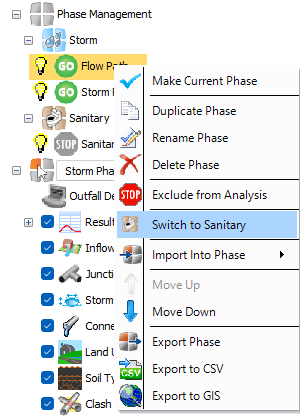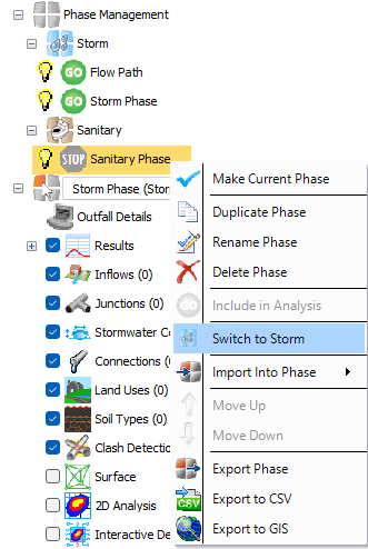 Right-clicking a Sanitary phase would display the option Switch to Storm.