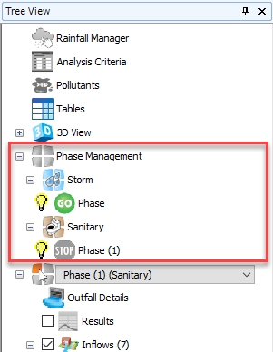 The Phase Management option appears in the Tree view below the Design level options and just before the Phase Selector. This provides a quick view on the available phases together with an image to indicate if they are being analyzed or not. Expanding the node will show you the list of available phases, which are grouped by phase type (either Storm phase and Sanitary phase).