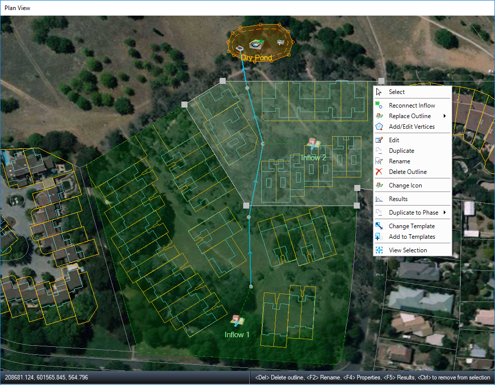 A Bypass Connection can be added via the right-click menu on Plan or via the Build Ribbon. When hovering over an inlet, junction or stormwater control the right-click menu will show this option and the connections available.