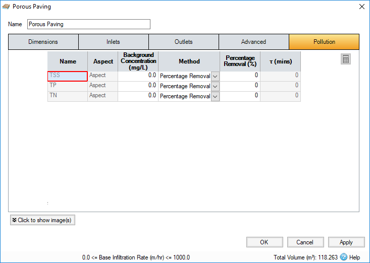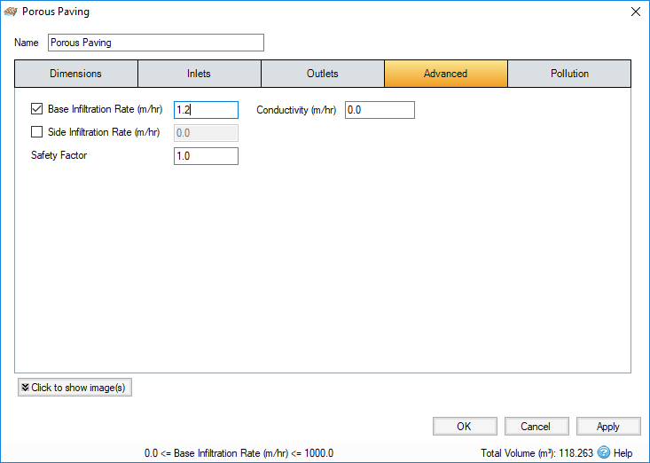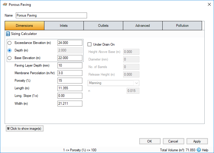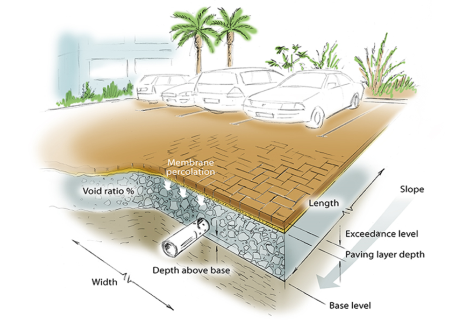 Porous paving stormwater controls may be used to model a range of stormwater controls including, but not limited to porous paving, permeable paving, permeable surfaces (e.g. tarmac), permeable interlocking paving, all with and without underdrain pipes.
