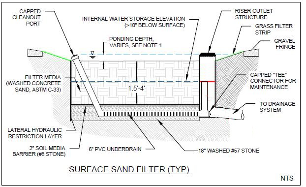 Release Height - Height above the invert of the under drain pipe at which the water is released (marked in red on the diagram below). This is commonly used to create a saturated zone.