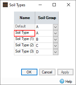 The top row of the table provides the Default Soil Type properties which will be used by all areas of inflows not covered by any Soil Type in the design.