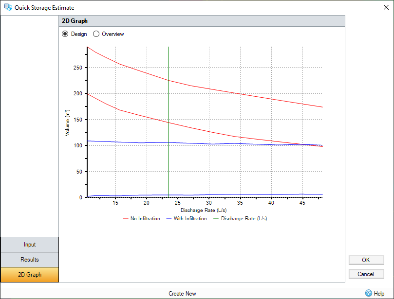 The Design graph shows the effects on storage requirements of varying the maximum discharge rate. The minimum and maximum storage is shown in purple. The green vertical line shows the specified maximum allowable discharge rate. If the infiltration coefficient is set to a non-zero value, then maximum and minimum storage requirements of an infiltration system are overlaid in blue.