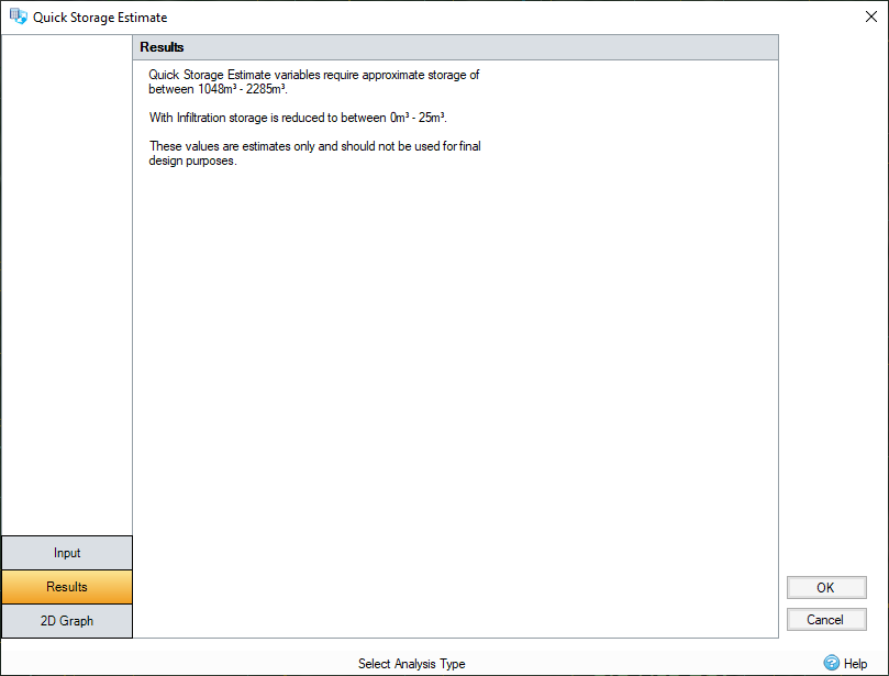 If the infiltration coefficient is set to a non-zero value, then a range of storage required will also be presented for an infiltration system.