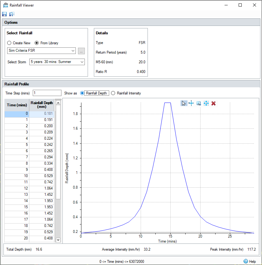 Show as: Toggle the table and graph between displaying Rainfall Depth and Rainfall Intensity.