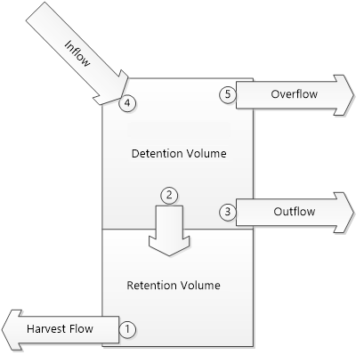 If the Retention volume is disabled then there is no retention storage or Harvest Flow. If the Retention volume is disabled the Inflow passes directly into the Detention volume which can overflow to the next node. If both volumes are disabled then Inflow passes straight to the Overflow. The diagram below shows how the movement of flow (and pollution load) are analyzed
