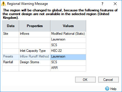 Upon first opening InfoDrainage, the region will be set by determining your PCs format region, in the same manner that the units are configured. If InfoDrainage could not recognize the format as being specific to a region, then the Global region must be selected.