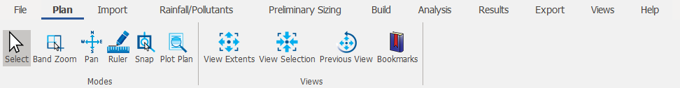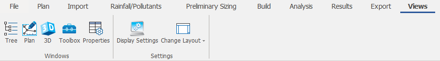 The Views Ribbon provides options to open or select different windows in InfoDrainage as well as an easy way to Change Layout of the windows and configure the Display Settings.