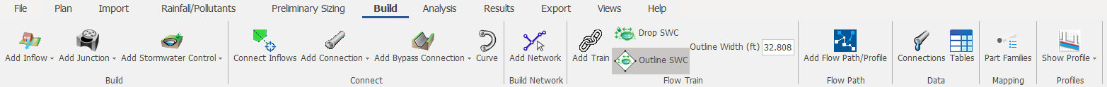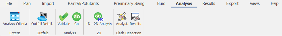 Validate the design of the treatment train and analyze rainfall and pollutant flow through the treatment train. For more information about this topic, go to Analysis Ribbon.