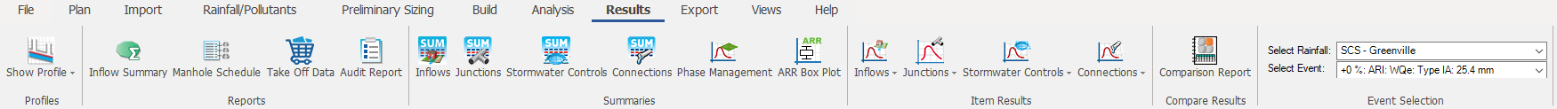 Import, create and manage rainfall records and pollutants. For more information about this topic, go to Rainfall Ribbon.