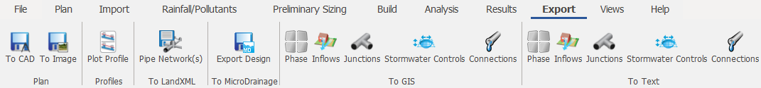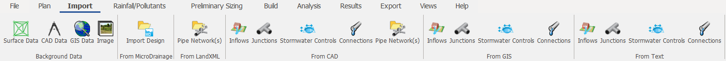 The ribbon tabs across the top of the screen give a simple, ordered approach to the typical workflow of managing site data and building a drainage scheme. There are quicker ways to access your data, but the ribbon tabs are a good way to begin.