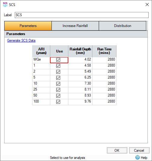 ARI (years) - A range of typical Annual Recurrence Intervals (ARI) listed for the SCS method.