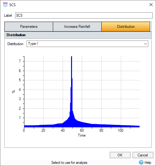 SCS hyetograph distributions Type 1, 1A, 2 and 3 are available by default, and are aligned with those in Appendix B of Technical Release 55. If an SCS hyetograph other than these is desired it is recommended to use the Design Storm (User Defined) option.